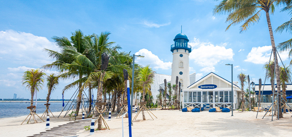Lokasinya di tepi pantai --sesuai namanya di ujung daratan. Ada restoran-restoran seperti Remy’s, Gure Gelato, Singapolah, Lucy by The Beach, ada kursi/sofa pantai, toko-toko fashion, dan beberapa fasilitas lain seperti lapangan padel, voli pantai. Landmark di sini adalah mercusuar berwarna putih dengan bagian atasnya biru. Bisa naik ke atasnya untuk melihat pemandangan ke arah laut dan sekitarnya. Saat libur Nataru begini mercusuarnya berdandan dekorasi Natal nan cantik. Jam buka: 08.00-23.00. Tapi khusus malam Tahun Baru 2026 tentu akan buka lebih larut, ada acara khusus seperti live music, led percussion, fire dance, dan tentu countdown bareng.