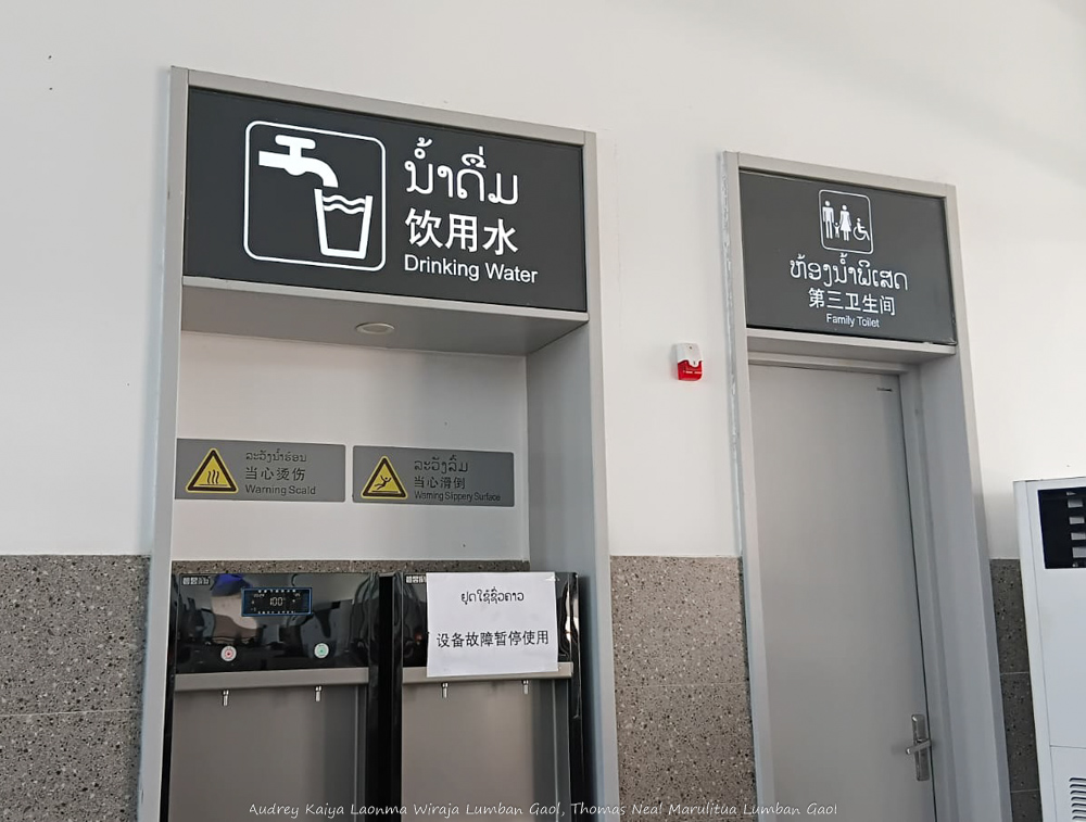 Terdapat mesin dispenser air (bisa air panas) seperti di stasiun-stasiun China. Semua tulisan dalam 3 bahasa (Lao, Inggris dan Mandarin)