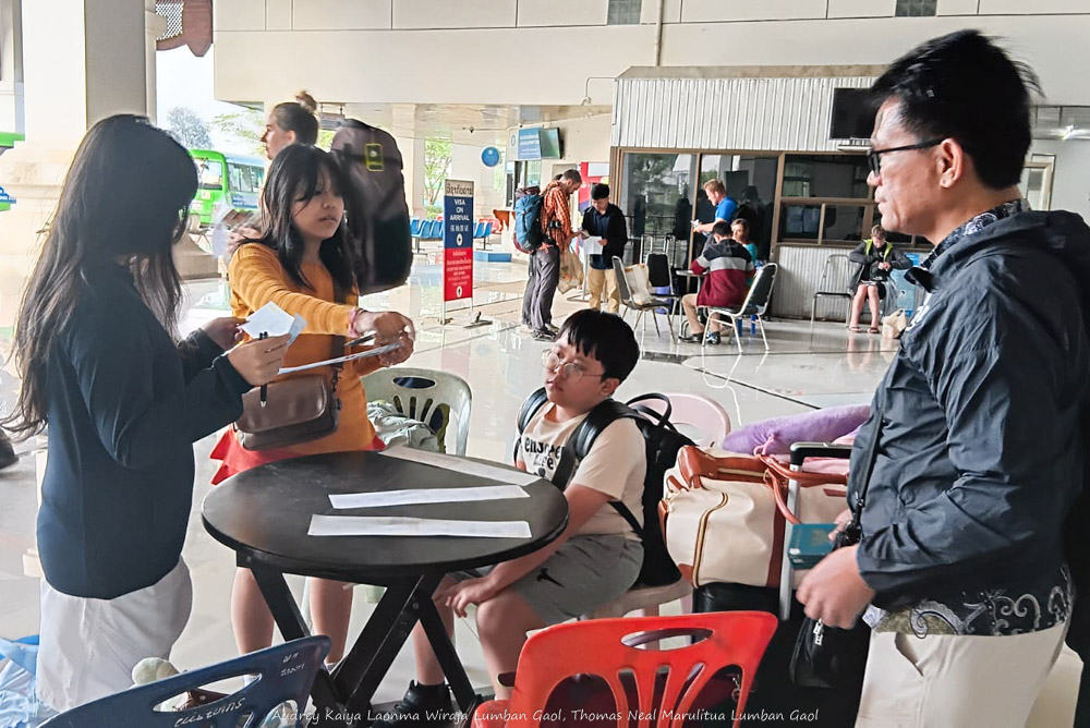 Di sini, rombongan kami dan rombongan lain (terlihat dari stiker yang berbeda) diarahkan oleh masing-masing agen perjalanan untuk mengisi manual kartu kedatangan. Karena warga berpaspor Indonesia tidak membutuhkan visa on arrival untuk masuk Laos, maka satu petugas agen perjalanan khusus membantu kami mengisi kartu kedatangan dan kartu keluar dari Laos. Petugas mengingatkan untuk menyimpan kartu keluar untuk diserahkan saat keluar dari Laos. Sementara anggota rombongan lain diarahkan petugas berbeda untuk membayar visa on arrival. Petugas agen juga menginstruksikan masing-masing anggota rombongan (yang menjadi tanggung jawabnya) untuk memotret barcode tiket kereta ke Luang Prabang dari ponsel miliknya.