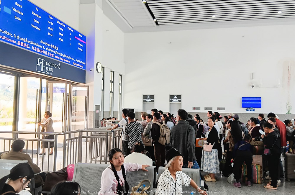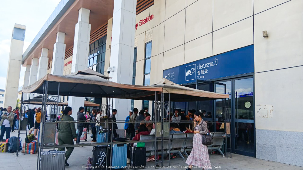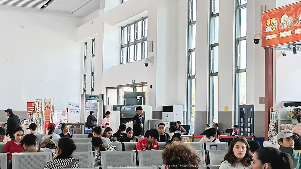 Stasiun Na Teuy besar dan berada di antara bukit-bukit hijau. Desainnya mirip stasiun kereta api di China. Setelah menunjukkan barcode dan semua barang bawaan dipindai (persis seperti di stasiun China), kami menunggu kurang lebih 2 jam untuk menaiki kereta menuju Luang Prabang. Lucunya, selain tulisan Bahasa Inggris dan Lao, banyak juga tulisan Hanzi Mandarin, bahkan toko di stasiun menerima Alipay dan Wechat Pay. Di sini banyak sekali penduduk lokal yang sama-sama menunggu kereta cepat buatan China ini.
