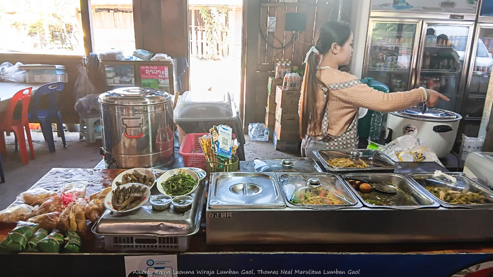 Aneka hidangan ala Laos siap disantap. Terdapat juga makanan seperti ketupat disiram santan. Banyak snack ringan termasuk Bengbeng buatan Indonesia