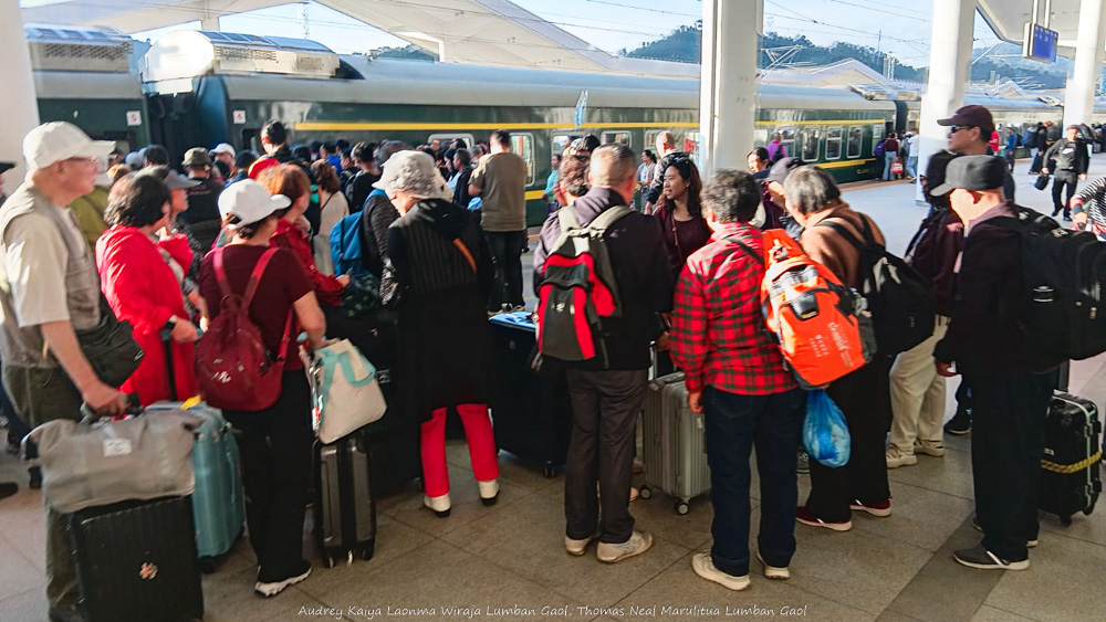 Rombongan turis China menuju Vientiane bersiap masuk kereta di stasiun Luang Prabang. Banyak sekali turis China datang ke Luang Prabang, mungkin karena sekarang akses masuk Laos lebih mudah
