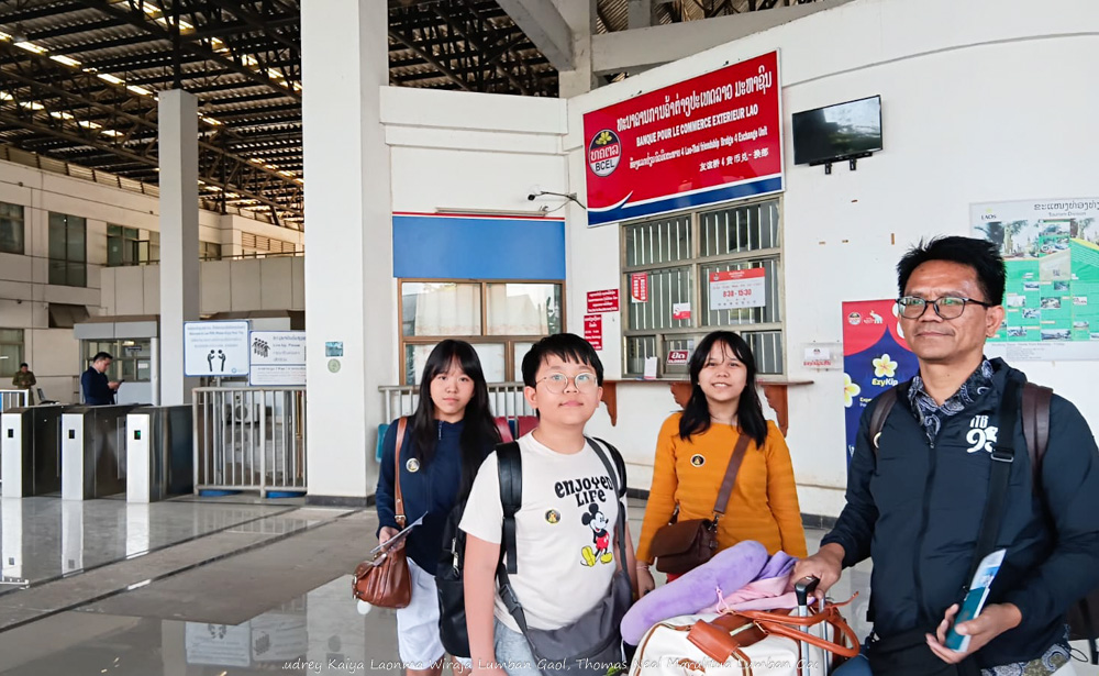 Keluar imigrasi Thailand, kami menunggu bus yang mengantar kami menuju Jembatan Persahabatan Thailand-Laos. Jembatan ini berdiri gagah melintasi Sungai Mekong yang lebar, menghubungkan Thailand dan Laos. Saya melihat banyak truk berisi barang-barang melintasi jembatan tersebut. Setelah semua penumpang naik, bus pun berjalan pelan melewati jembatan dan menurunkan kami di depan Gedung Perbatasan Laos yang uniknya berbentuk hampir sama dengan Gedung Perbatasan Thailand.